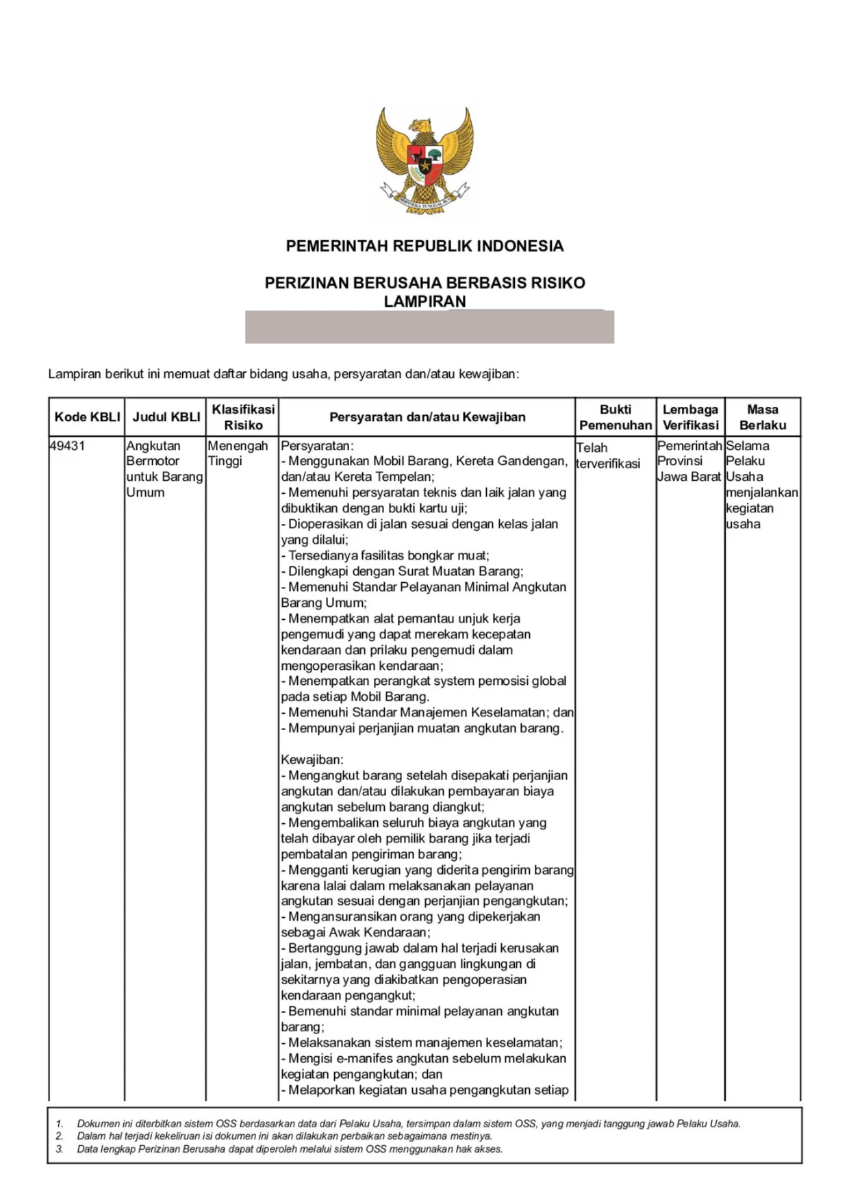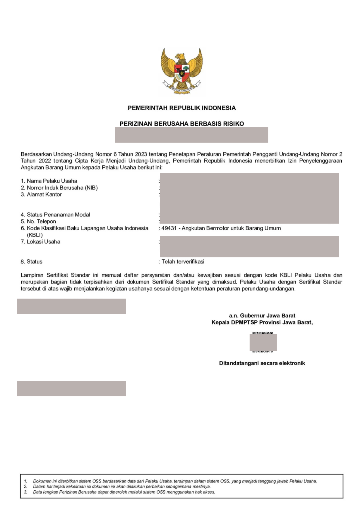 Legalmu.com siap membantu proses pengurusan izin angkutan bermotor untuk barang umum (KBLI 49431) agar usaha Anda dapat berjalan lancar tanpa kendala perizinan. Dengan tim profesional dan pengalaman di bidang legalitas usaha, kami memastikan semua dokumen diproses dengan cepat dan sesuai ketentuan yang berlaku.